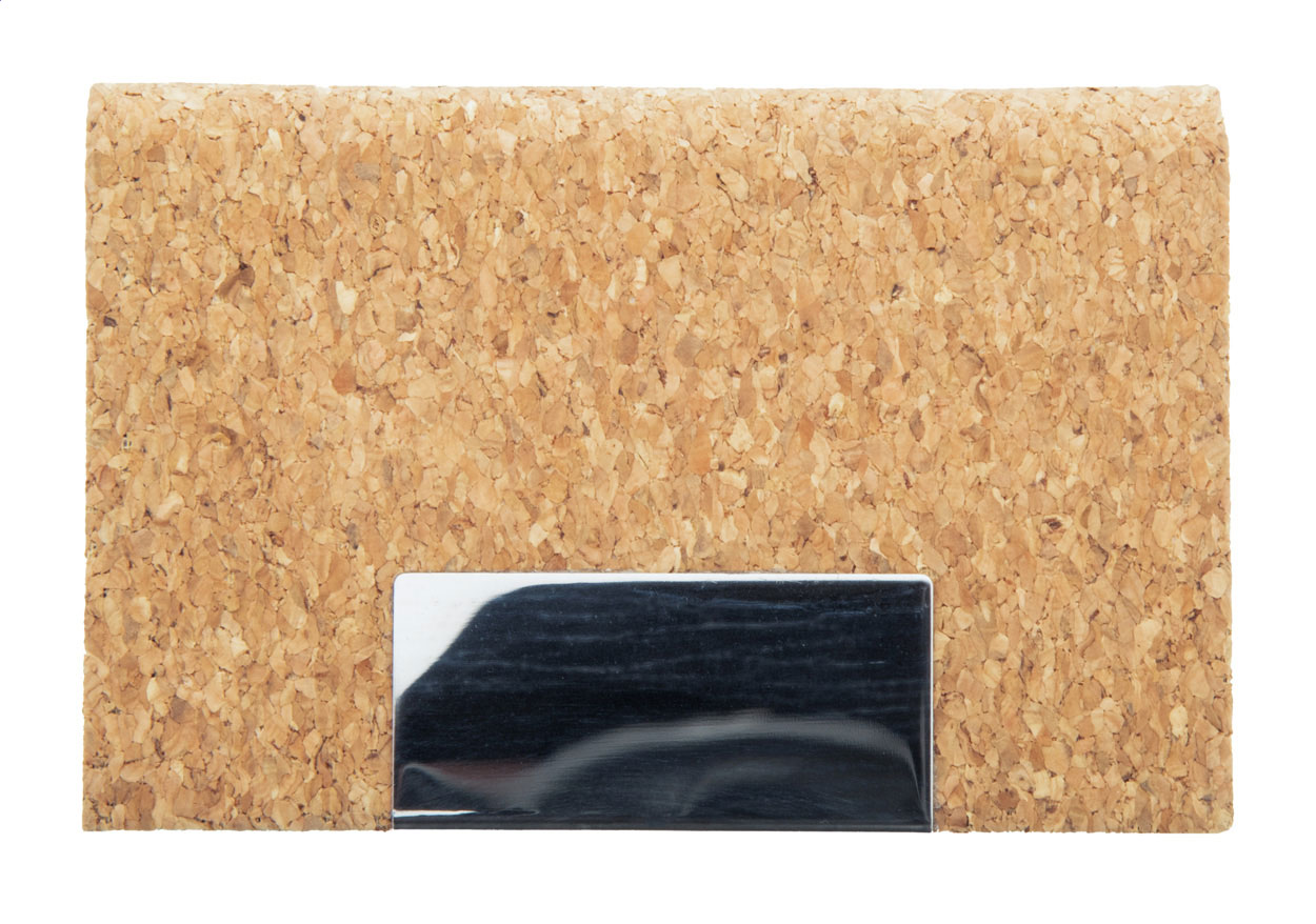 Descoperă un suport pentru cărți de vizită elegant, din metal durabil, acoperit cu plută naturală. Dimensiuni: 95x64x14 mm. Ideal pentru cadouri corporate!