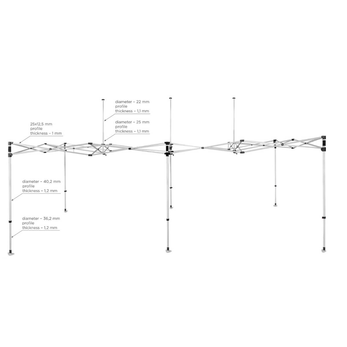 Cel mai generos spațiu pentru evenimente memorabile! > Ai nevoie de un stand cu adevărat impresionant? Sistemul de cort pliabil de 3x6 m îți oferă o suprafață de expunere masivă și o stabilitate excepțională. Construit pe un profil hexagonal ultra-rezistent, acest cadru face față cu brio oricărei provocări, iar geanta tip troller inclusă face ca transportul să fie surprinzător de ușor!