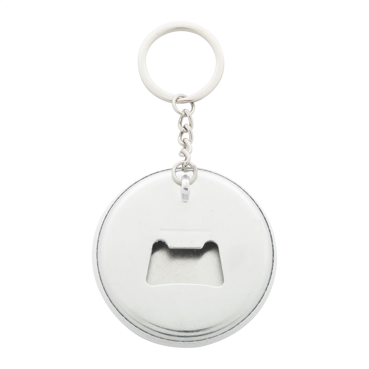 Desfăcător de sticle metalic cu insignă mare (ø58 mm), personalizat cu inserție de hârtie full colour. Imprimare digitală inclusă!