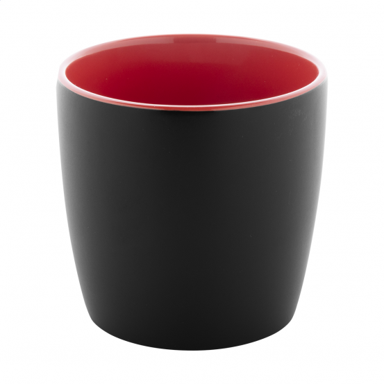 Eleganță și contrast într-un singur produs! Cana Matara Nera atrage toate privirile prin exteriorul său negru mat, sofisticat, care contrastează perfect cu interiorul lucios și viu colorat. Este alegerea excelentă pentru a-ți evidenția logo-ul, fiind un cadou corporate memorabil sau accesoriul perfect pentru o cafea plină de energie la birou.